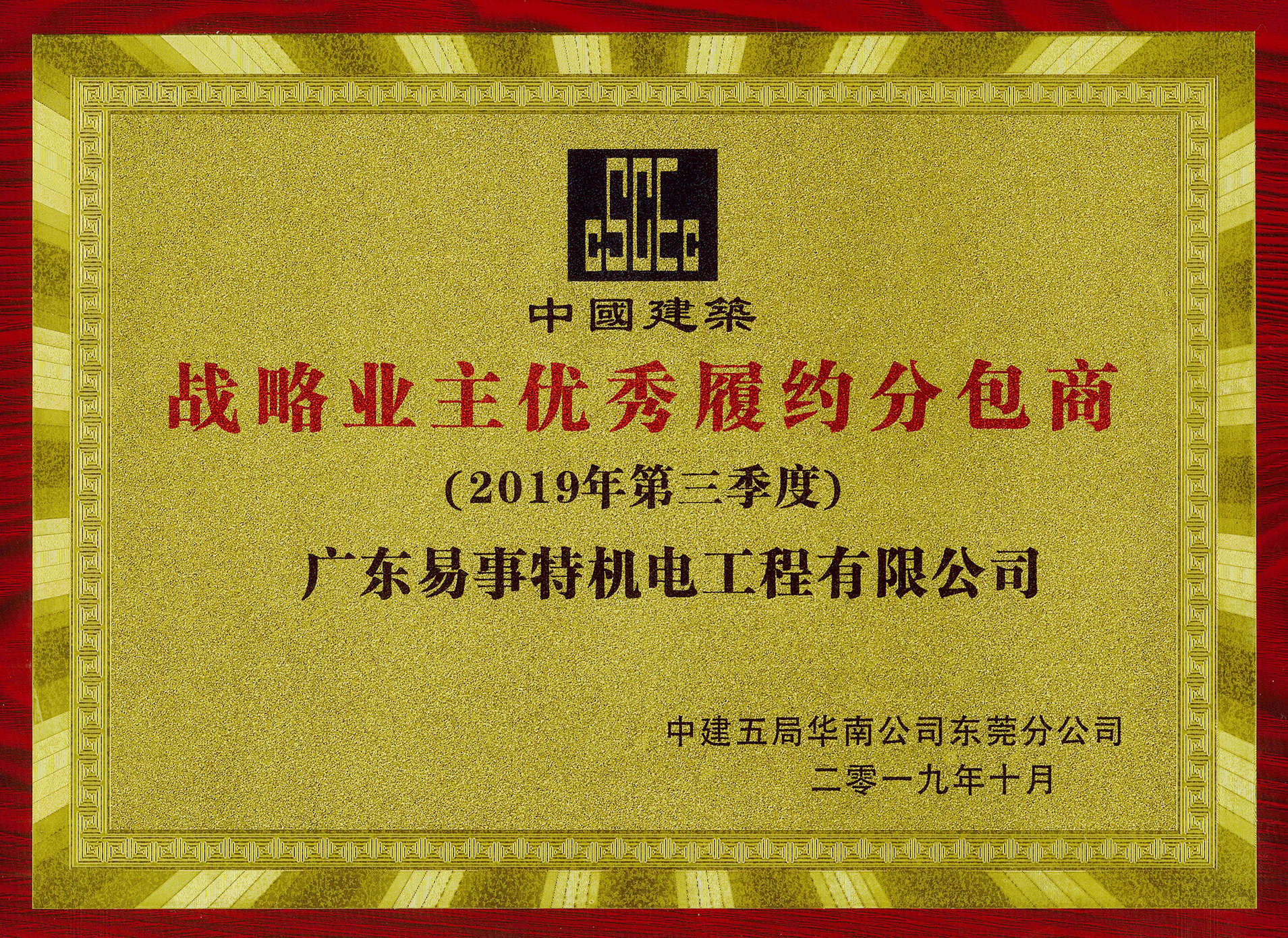 2019年10月27日,中國建筑第五工程局有限公司華南公司東莞分公司舉辦了“戰略業主優秀履約分包商”表彰大會。會上,中建五局華南公司東莞分公司對在2019年第三季度有作出重要貢獻的合作企業進行表彰。廣東易事特機電工程有限公司因珠海華潤項目的優秀表現獲評“戰略業主優秀履約分包商”殊榮...